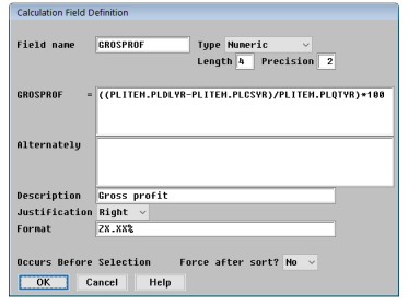 Now your cursor is in the GROSPROF field, which is where you define the calculation. Ultimately, our calculation will look like this: