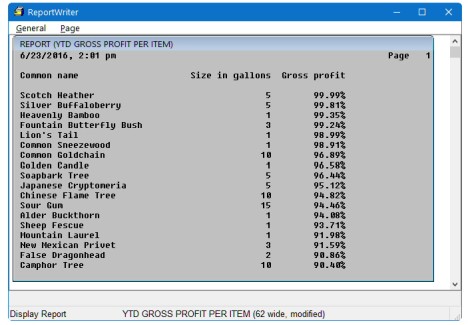 In this exercise, we’ll create a report that gives the year-to-date gross profit percentage for each inventory item, sorted by plant size and with an average gross profit figure for each size.