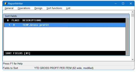 Notice that an uppercase “R” appears to the left of the field name. This tells ReportWriter to reverse sort on that field. (See figure 2.)