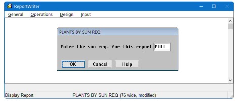 For this report, we’re going to prompt the user for the sun requirements of the plants to include in the report. Because the sun requirements are stored in the file as “FULL,” “PART,” “SHADE,” or “ANY,” we’ll need to create an alphanumeric field.