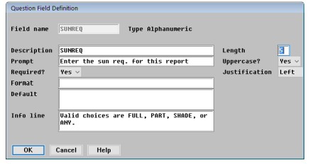 In the Info line field, enter “Valid choices are FULL, PART, SHADE, or ANY.” This text displays at the bottom of the screen when the user generates the report. You’ll most commonly use this area for short help messages. |