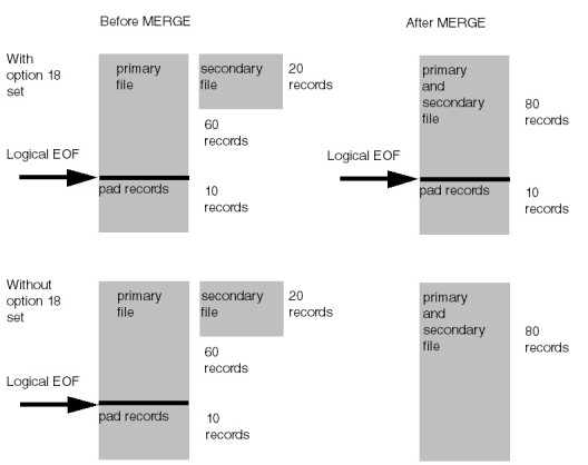 If you don’t set option #18, the in-place MERGE treats any logical end-of-file character or record as the end of usable data in the primary file. Any records that follow the logical end of file are overwritten.