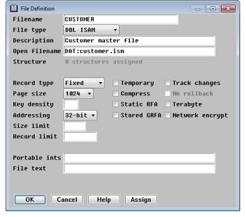 You can assign structures to your file at this point (or disassociate assigned structures), without exiting the File Definition input window. See Assigning structures to files for more information. |