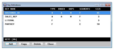 The order of your access keys determines the key of reference used by xfODBC and ReportWriter to access the file (unless you define an explicit key of reference). The maximum number of keys that can be defined within one structure is 99.