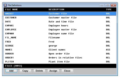 To display the File Definitions list, select Modify > Files. For each file, the following information is displayed: