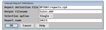 Enter the name of the sequential file into which the report definitions will be unloaded. If you don’t specify an extension, it defaults to .ddf.