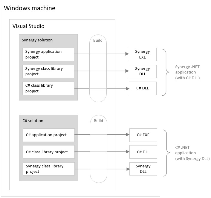 One of the advantages to using .NET is that Synergy assemblies can use .NET classes and can interoperate with assemblies written in other .NET languages (e.g., C#; see figure 2 below). So in addition to invoking .NET functionality in your code, you can include Synergy projects in solutions for other .NET languages, and you can include projects for other .NET languages in Synergy solutions.