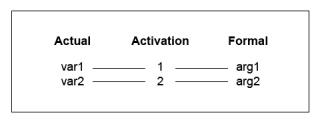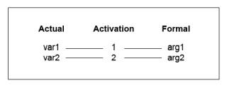 When calling a subroutine with the XCALL statement, the actual, formal, and activation mapping is straightforward. The first actual argument corresponds to the first activation argument, which corresponds to the first formal parameter. The second actual argument corresponds to the second activation argument, which corresponds to the second formal parameter, and so on.