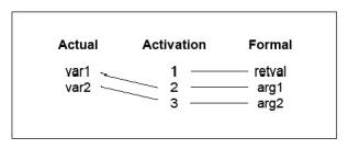 In non-^VAL functions, the return value is passed as an argument, becoming the first activation argument. For example, in this call, the return value retval and the actual argument 4 become the activation arguments: