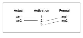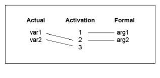 In subroutines and ^VAL functions, the actual arguments become the activation arguments. For example, in this call, the actual arguments 1, “abcd”, and var1 become the activation arguments: