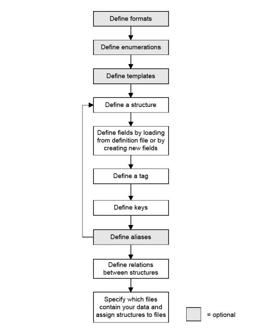 Figure 1 illustrates the steps you might follow to populate your repository. We recommend the order shown here, although you have some latitude of course. For example, as you are defining fields, you may realize a template for a particular type of field would be a useful or you might want to define aliases for structures as you go along.