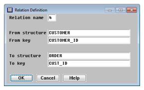 | 2. | In the Relation Definition window, modify data as desired. For details on the fields, see step 2 under Defining a new relation. The relation name and the “from” structure cannot be changed. |