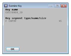 If a key allows duplicates, “Dups” is displayed to the right of the key name. The segment information includes the type and size of each key segment: F (Field), L (Literal), E (External), R (Record number).