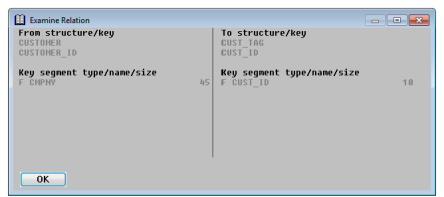 | 2. | Select Relation Functions > Examine Relation. This window describes the key segments that are used in the current relation, and contains the names of the “from” structure, the “from” key, the “to” structure, and the “to” key. (See figure 4.) |