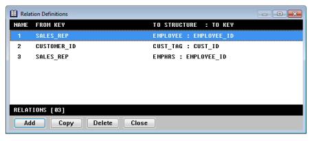 The Relation Definitions list displays the following information about relations for the current structure. (See figure 1.)