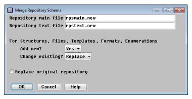 If you’re loading a schema file created by Toolkit’s Script-to-Repository conversion program (scridl), specify the name of the existing repository in the Repository main file and Repository text file fields. In the Add new field, select Yes; in the Change existing field, select Overlay. |