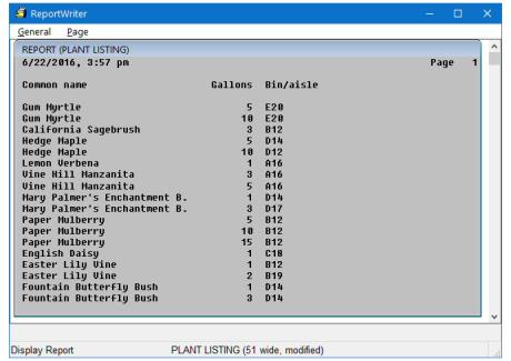 Now, your report layout should look like figure 3. The fields are displayed in the order in which you selected them. But it makes more sense to show the name of the plant first, and then its size, right? Let’s change the order of the fields to Common name, Size in gallons, Bin/aisle.