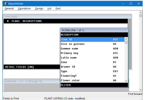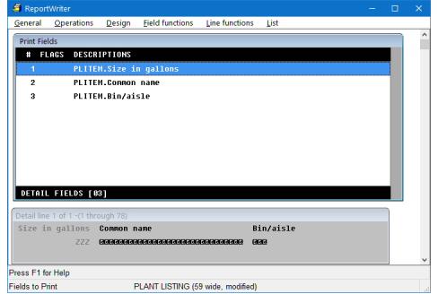 You’ll see two lists and a window. The list of available fields shows the fields available for printing in the plant item file. The Print Fields list shows the fields you’ve selected to include in the report; it’s empty until you select a field. The Detail line window at the bottom of the screen shows how your report will look, based on the fields you’ve selected. (See figure 2.)