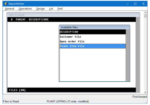 Select Design > Files to read. A list of available files is displayed, as shown in figure 1. For this report, we’ll use the plant item file. |