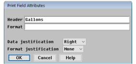 Press Enter to display the Print Field Attributes window. From here, you can change the header for this field in the report, the format of the field (used primarily with numeric data), the justification of the data (left, center, or right), and the justification of the format (none, left, or right). |