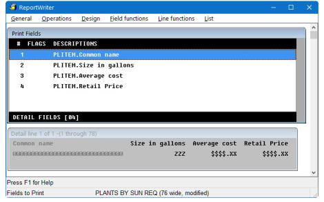 For this report, we’re going to prompt the user for the sun requirements of the plants to include in the report. Because the sun requirements are stored in the file as “FULL,” “PART,” “SHADE,” or “ANY,” we’ll need to create an alphanumeric field.