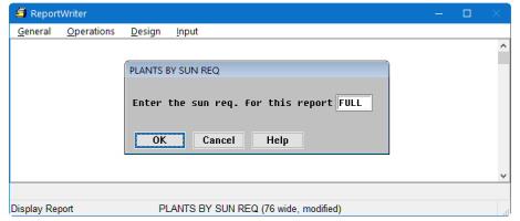 Enter “PLANTS BY SUN REQ” in the Report name field and press Enter. |