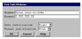 | 2. | Modify the fields in the Print Field Attributes window as necessary. See the following sections for instructions: |