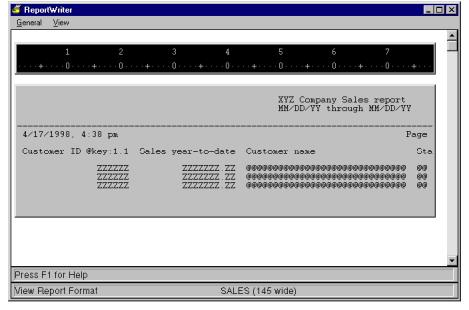 Any time a complete report is loaded, regardless of what function you’re performing, you can view your report’s current format. Note that this shows you the format only, not the actual data. To view your report with data on screen , see Displaying a report on the screen.