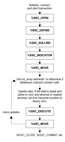 When binding a char, date, datetime, numeric or float column with null, you can use %SSC_INDICATOR to determine if the column is currently null. You can then use this information to determine if the update value should be stored as null.