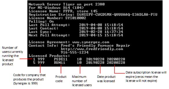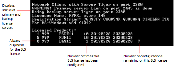 Display license information, including licensee name, registration string, licensed products, and polling data. See figure 1. This command will first start License Manager if it is not already running.