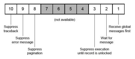 The runtime option flags. Each flag is a single digit, and the digit positions are assigned ordinal numbers from right to left. Thus, the low-order digit is digit number 1. Synergy DBL examines the flags value digit by digit to determine which flags are set, and hence, which functions are to be performed. The Discussion contains a detailed description of the flags and their meanings. (n)