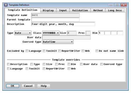 The Template Definition window displays with tabs on which you can define template information. Instructions are given in this section for the Template Definition tab, but not for the other tabs, as they are the same as the tabs for fields.