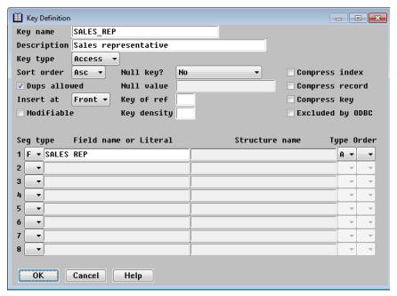 The following eleven fields apply to access keys only. If you select Foreign in the Key type field, these fields are disabled, and the cursor moves to the first segment definition.