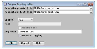 | 1. | Select Utilities > Compare Repository to Files. The default repository filenames displayed are determined by the logic discussed in Determining the repository files used. |