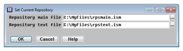 The Set Current Repository utility changes the default repository filenames for the current Repository session by temporarily setting the RPSMFIL and RPSTFIL environment variables. The default repository filenames determine the repository to open when you select an entry from the Modify or View menu, and are also used to prefill the Repository main file and Repository text file fields in the Utility functions.