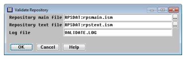 | 1. | Select Utilities > Validate Repository. The default repository filenames displayed are determined by the logic discussed in Determining the repository files used. |