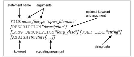 - Statement names (such as FILE) and keywords (such as LONG DESCRIPTION) are shown in UPPERCASE.
