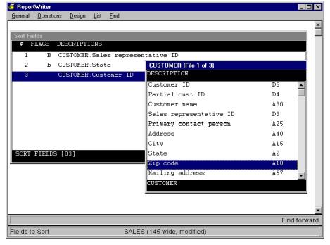 You can select up to 10 fields on which to sort. If the field you select is an arrayed field, only literals are allowed as subscripts. If the field you select is larger than the maximum field size (99), you are prompted to specify a range of characters.