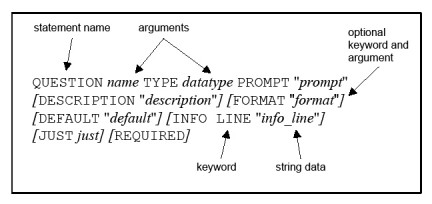 QUESTION CITY TYPE ALPHANUMERIC SIZE 30 PROMPT "City:" DEFAULT "*" INFO LINE "Enter name of city."