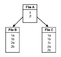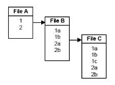 In hierarchical relationships, the total number of detail records created for a given primary file key value is the number of records for that key value in each of the secondary files, multiplied together. For instance, in the example above, the total number of detail records for a primary file value of “1” is 6 (the number of matching “1” records from File B multiplied by the number of matching “1” records from File C, or 2 * 3 = 6).