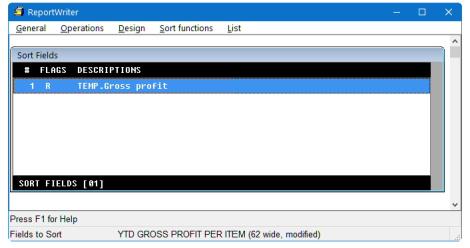 Notice that an uppercase “R” appears to the left of the field name. This tells ReportWriter to reverse sort on that field. (See figure 2.)
