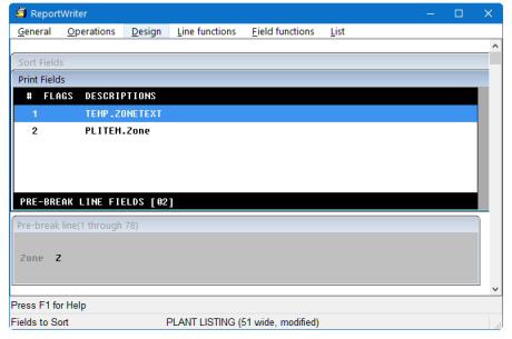 To do this, we need to create a text field that prints “Zone,” and then select that field and the actual zone data field to print in a pre-break line. First, let’s create the text field.