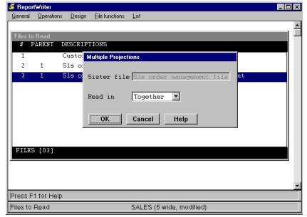When one of your files to read is directly related to two or more files (for example, File A relates to File B and File A relates to File C), you can specify the method in which those secondary files should be processed. The default method is to create detail records that combine data from both secondary files. The multiple projection option enables you to create detail records first from one file, then from the second file, for a given key value in the primary file. Optionally, using a common sort key, you can then merge the records. See Understanding multiple projections for a more detailed explanation.