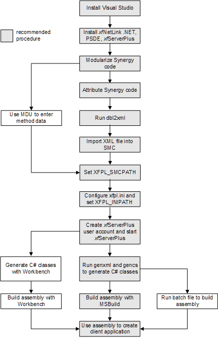 This topic lists all the steps that need to be completed to successfully create a distributed system using xfNetLink .NET. Note that these steps may not all be done by you, the Synergy developer. For example, you may create the Synergy assembly and give it to a .NET developer to create a web front-end for your application. The .NET developer may also work with a web-page developer to create the HTML portions of the user interface. However, these steps should give you a feel for everything that needs to be done, regardless of who does it.