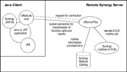Figure 1 shows the primary components of a distributed application that accesses Synergy code from a Java client. This diagram describes two machines: