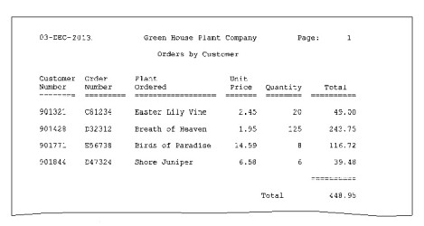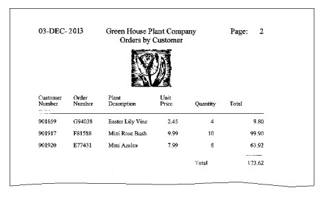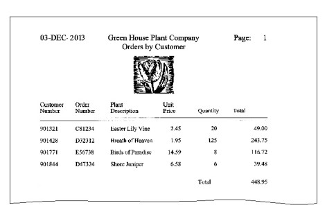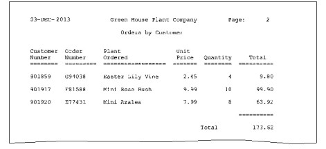 The winrpt1.dbl program shows how to convert an LPQUE report printout to use the Synergy Windows printing API. This program demonstrates the basics of Windows printing using a fixed font. The advantage of this method is that you can easily set the font of an existing report and print it out to a different printer with similar results. If you compile, link, and run this program, your output should look similar to the samples below: