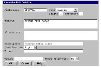 For example, when you use the calculation field defined in figure 1, you get the numbers 1, 2, 3, and so on, instead of blue, red, yellow, and so on. This temporary field can be used for printing, selecting, sorting, or in conditionals.