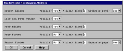 Enter Yes if you want the specified header or footer and the page number and current date to be printed on each page. Enter No if you don’t want the header, footer, or page number and date printed. The default response is Yes for report headers, page headers, and the page number and date, and No for report and page footers.
