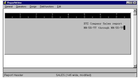The report header appears at the beginning of your report. The default header is the name of the report, in uppercase letters. The report header can be up to 10 lines long; each line automatically scrolls to 255 columns.