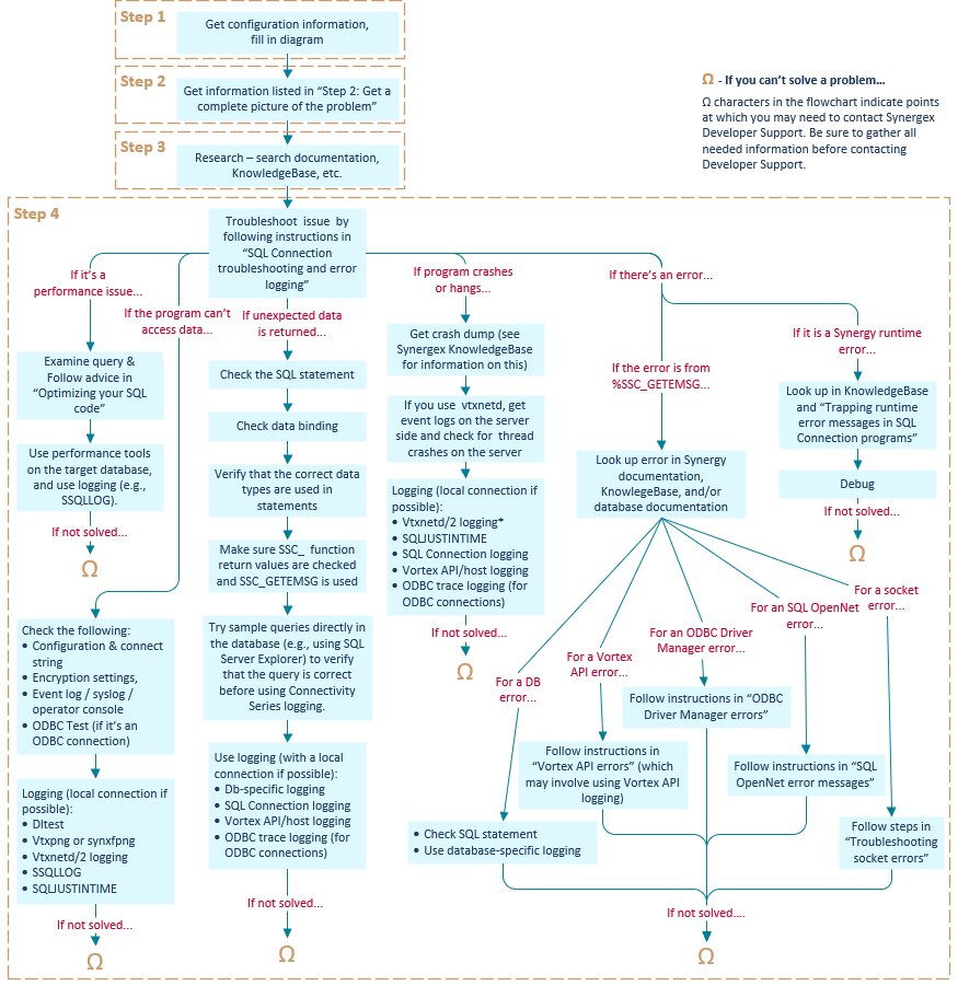 You won’t necessarily go through all the flowchart steps for every SQL Connection issue. You may discover the solution at any point in the process, and there can be situations where you’ll need to contact Synergy/DE Developer Support to resolve an issue (as the Ω characters in the flowchart indicate).